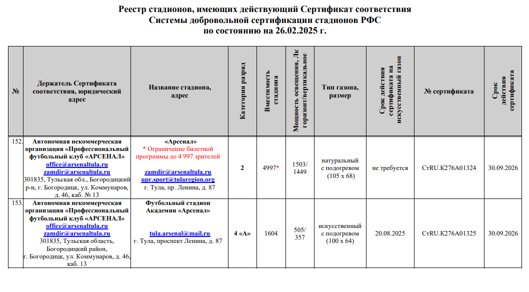 Реестр стадионов, имеющих действующий сертификат соответствия системы добровольной сертификации стадионов РФС